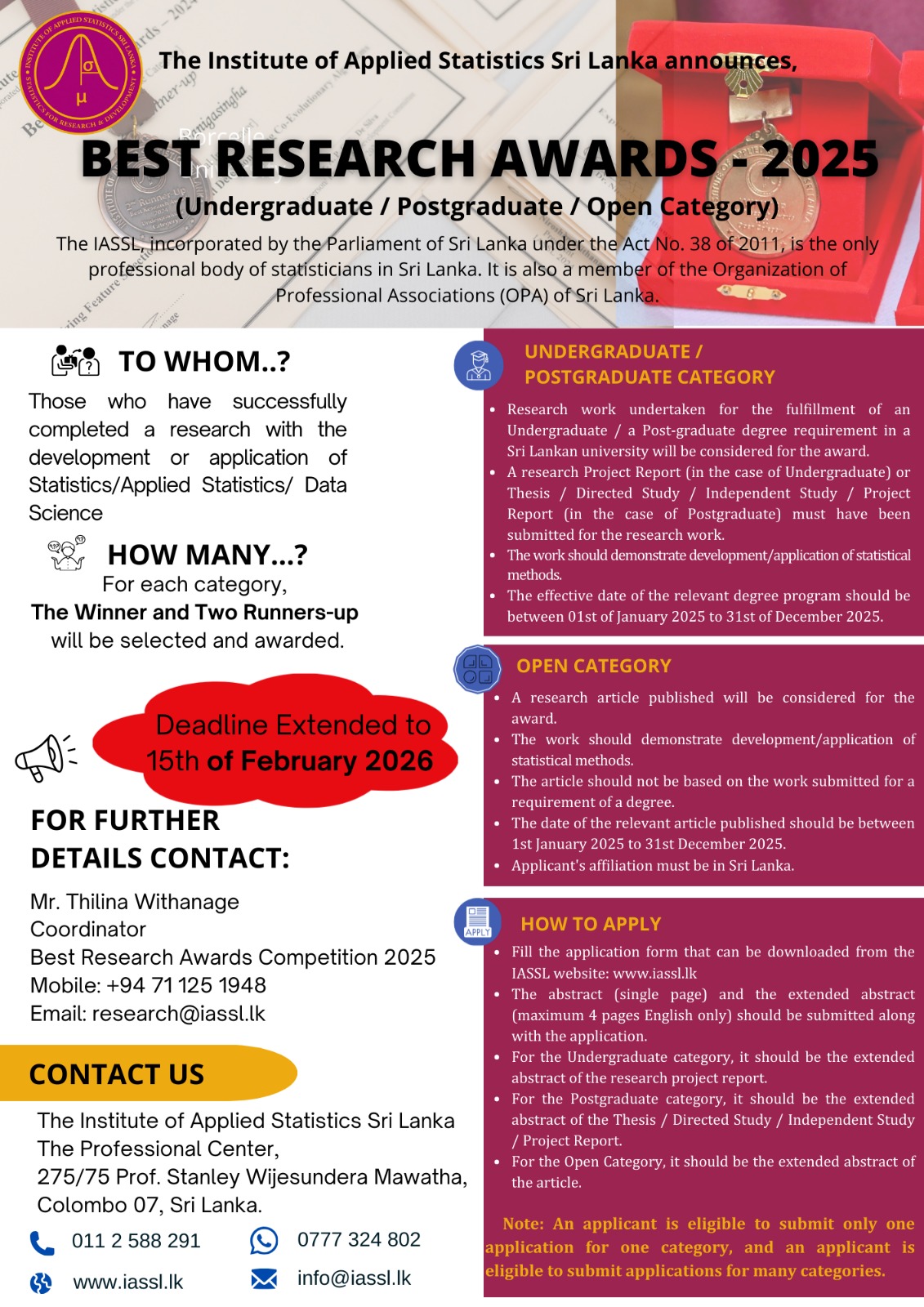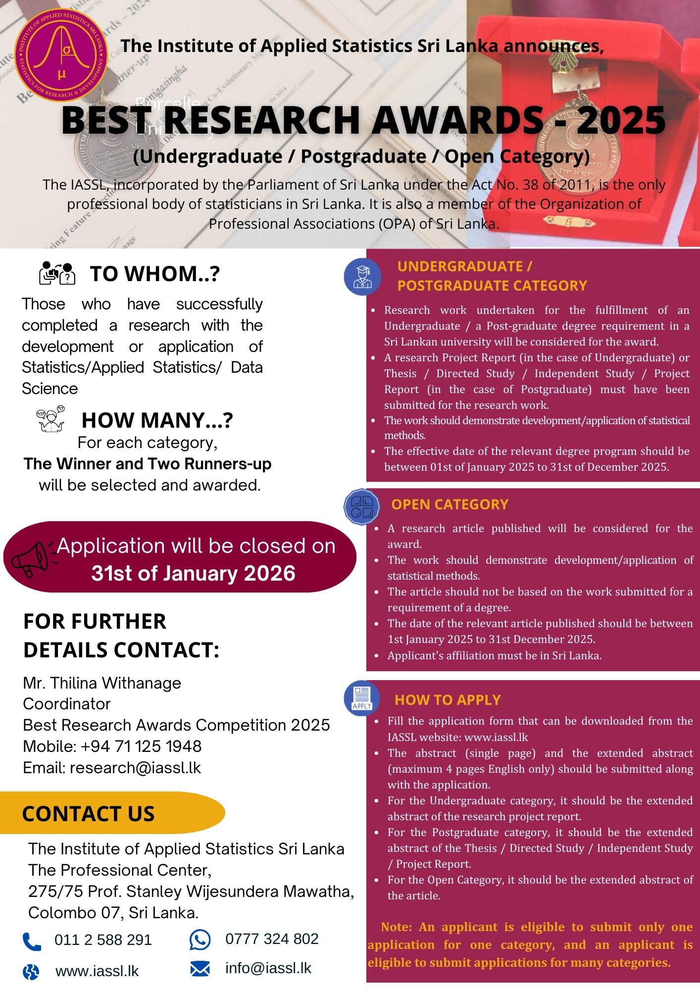 The Institute of Applied Statistics, Sri Lanka (IASSL) is calling applications for the Best Research Awards – 2025 for those who have successfully completed research with the development or application of Statistics/Applied Statistics/Data Science.