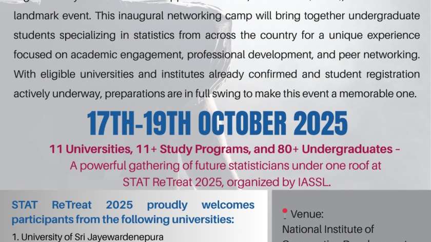 9 Oct STAT ReTreat "STAT ReTreat 2025 – Empowering the Next Generation of Statisticians" Sri Lanka’s first-ever residential camp for undergraduate students in statistics…Read More