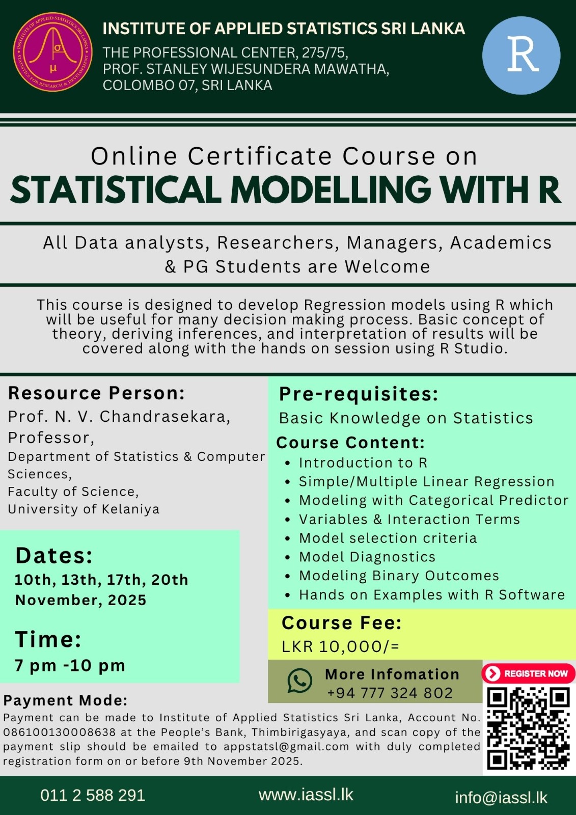 📊 Master Statistical Modelling with R – Online Certificate Course Offered by the Institute of Applied Statistics Sri Lanka (IASSL)