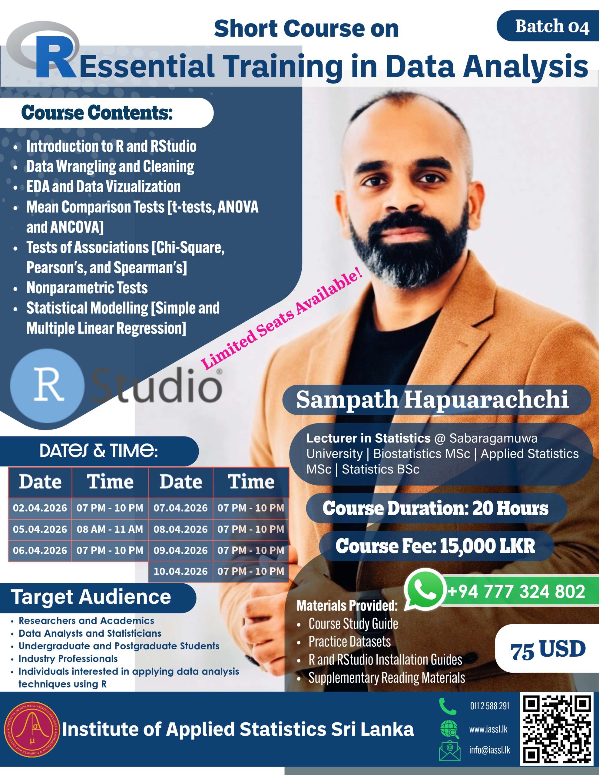 Join the “R Essential Training in Data Analysis with R” short course conducted by the Institute of Applied Statistics Sri Lanka (IASSL)!